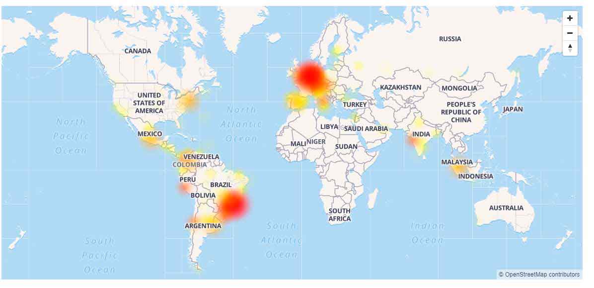 Hoje foi reportada nova instabilidade no whatsapp, segundo o site downdetector.com a falha ocorre mais na região do Brasil e Europa, segue mapa: